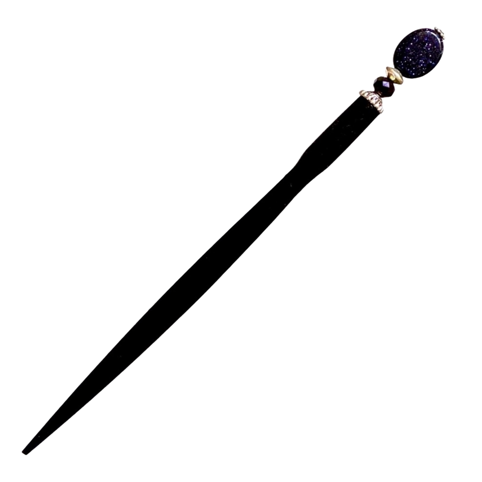 Worn on “The Young and The Restless” by Zuleyka Silver! This stunning stick has an oval blue goldstone bead that glimmers with lavender and blue sparkles. The smaller bead is a sparkly crystal rondelle. Photos just can't do Andromeda justice.