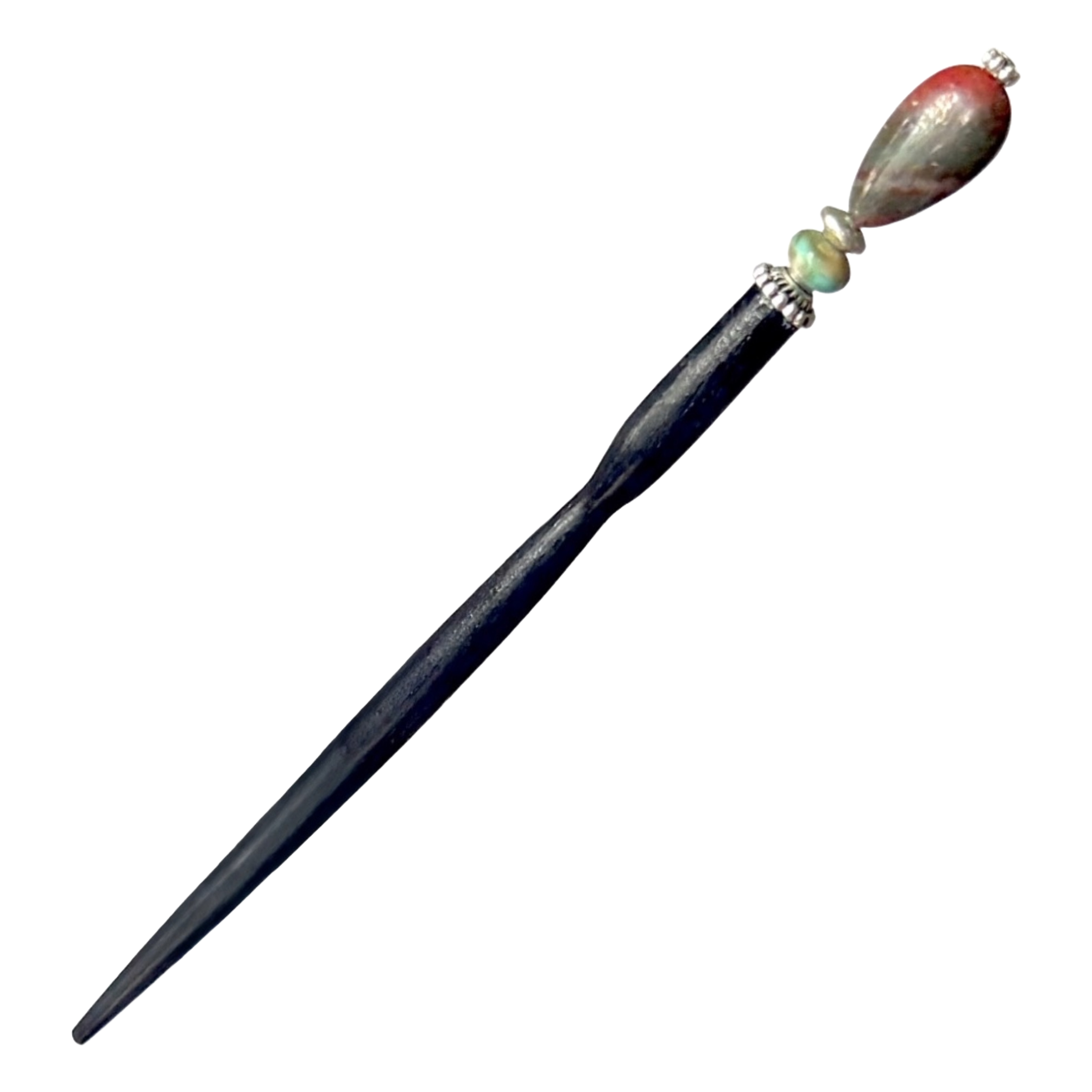 Our earth-toned Bree Hair Stick is made with a teardrop shaped Rainbow Jasper bead that will match most outfits. It's versatility makes it perfect for travel! The large stone is red, brown, and orange and the small bead is a brown and turquoise Czech glass bead.