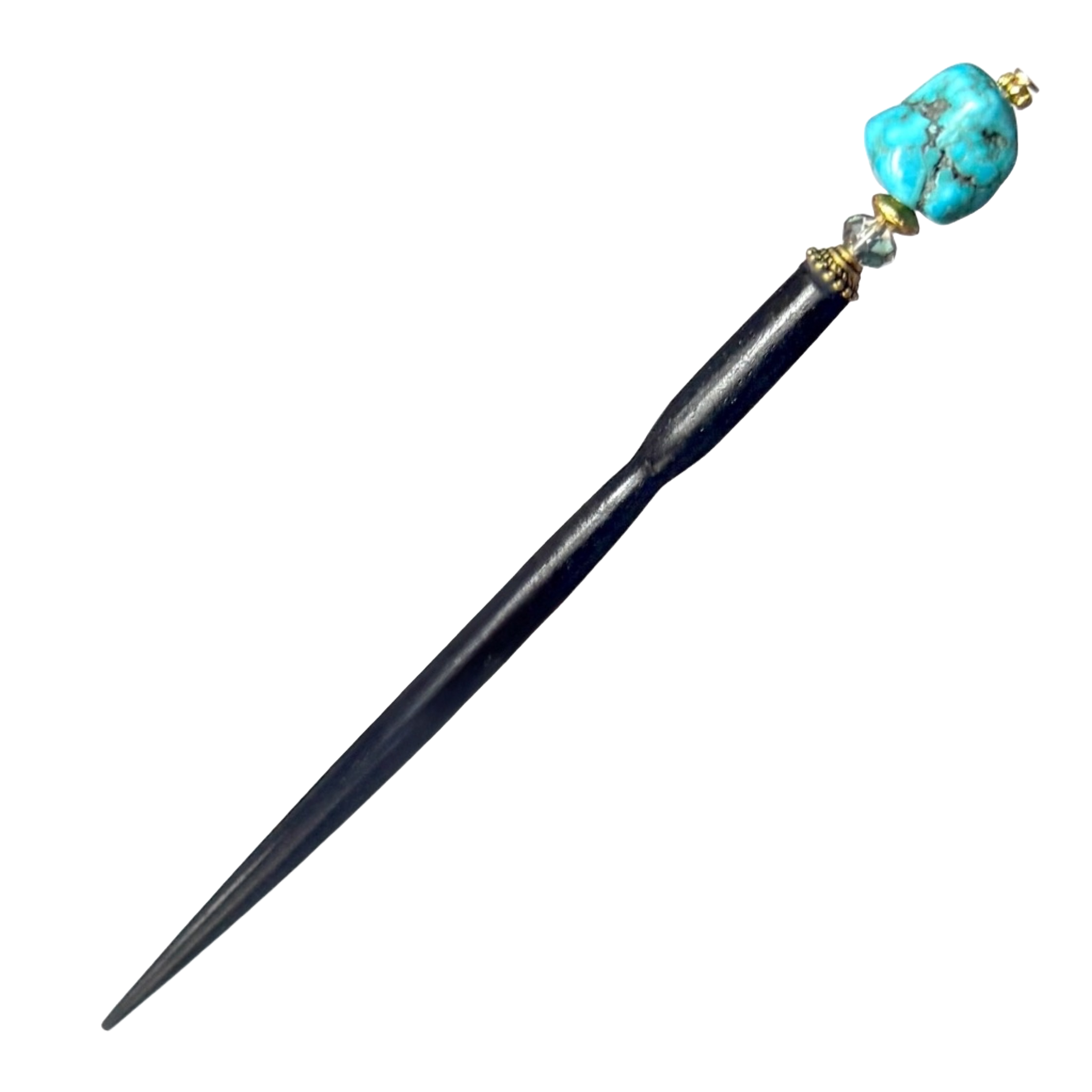 The standard base is a 4 1/2 inch black lacquered wood with a unique tapered shape, but after beads are added, the Hair Stick is around 5 1/2 to 6 inches total. A large 6 inch base is available at no additional cost. Most customers prefer to use the smaller 4 1/2 inch base, but you may want to go for the larger 6 inch size if your hair is extremely thick or very long. Click HERE to read more about sizes.
