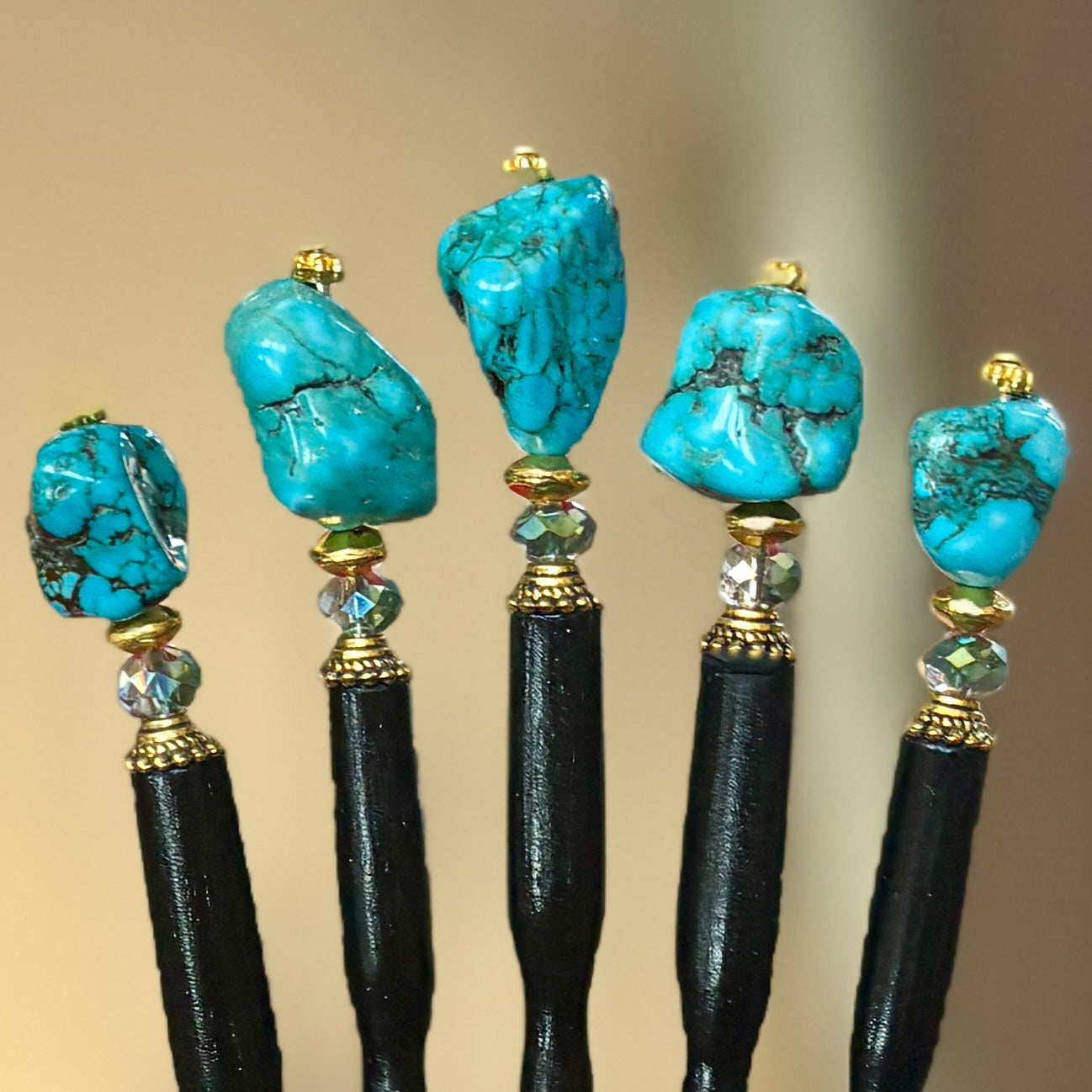 The Indie hair sticks are made with antique gold hardware and blue green magnesite nuggets. Magnesite is associated with grounding and stabilizing energies, helping to anchor one’s energy to the Earth It is believed to promote a sense of harmony and balance, both within oneself and in relationships with others.