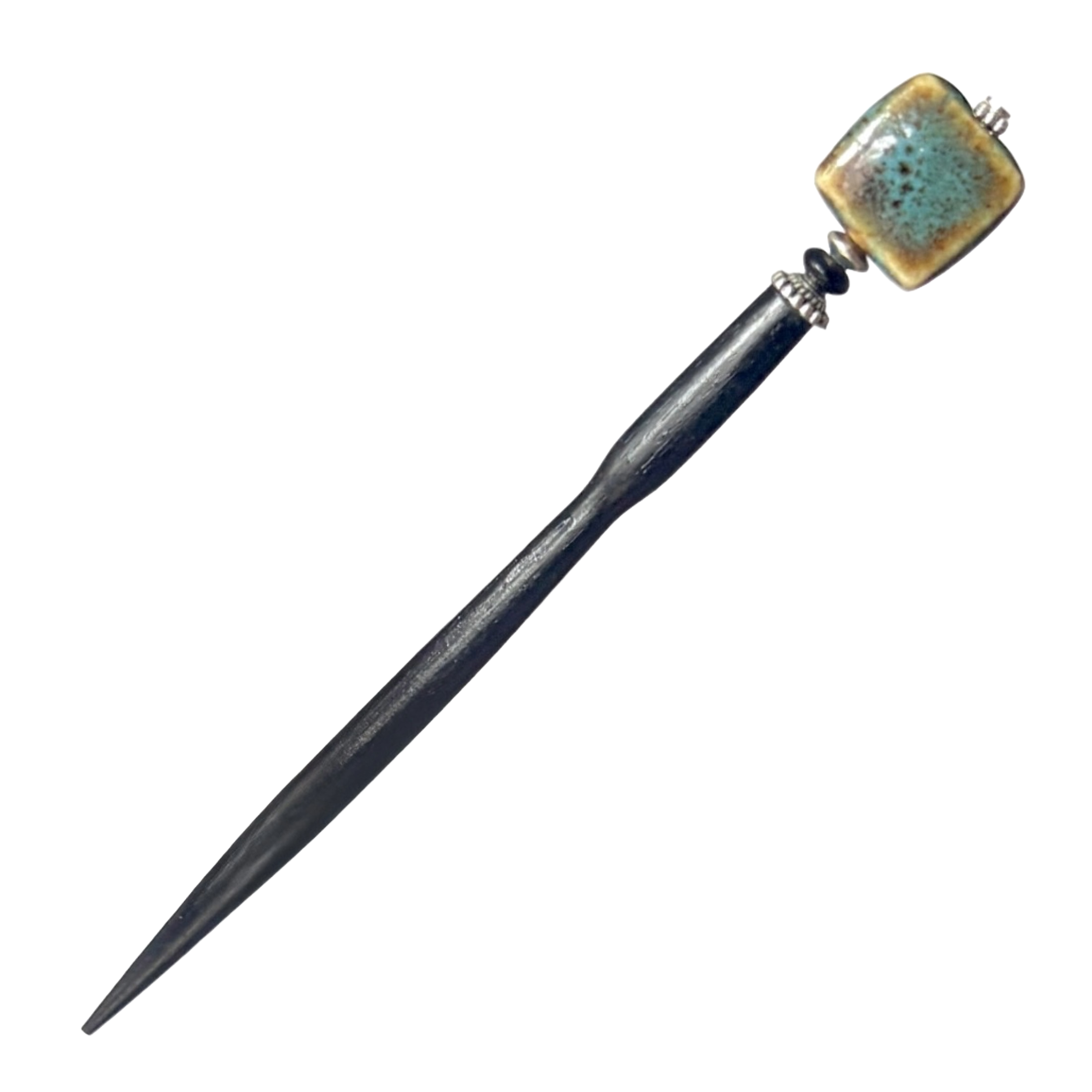 This earthy, bohemian hair stick has a large square ceramic bead with variations of browns, greens and blues. Lark is perfect for your effortless chic style.