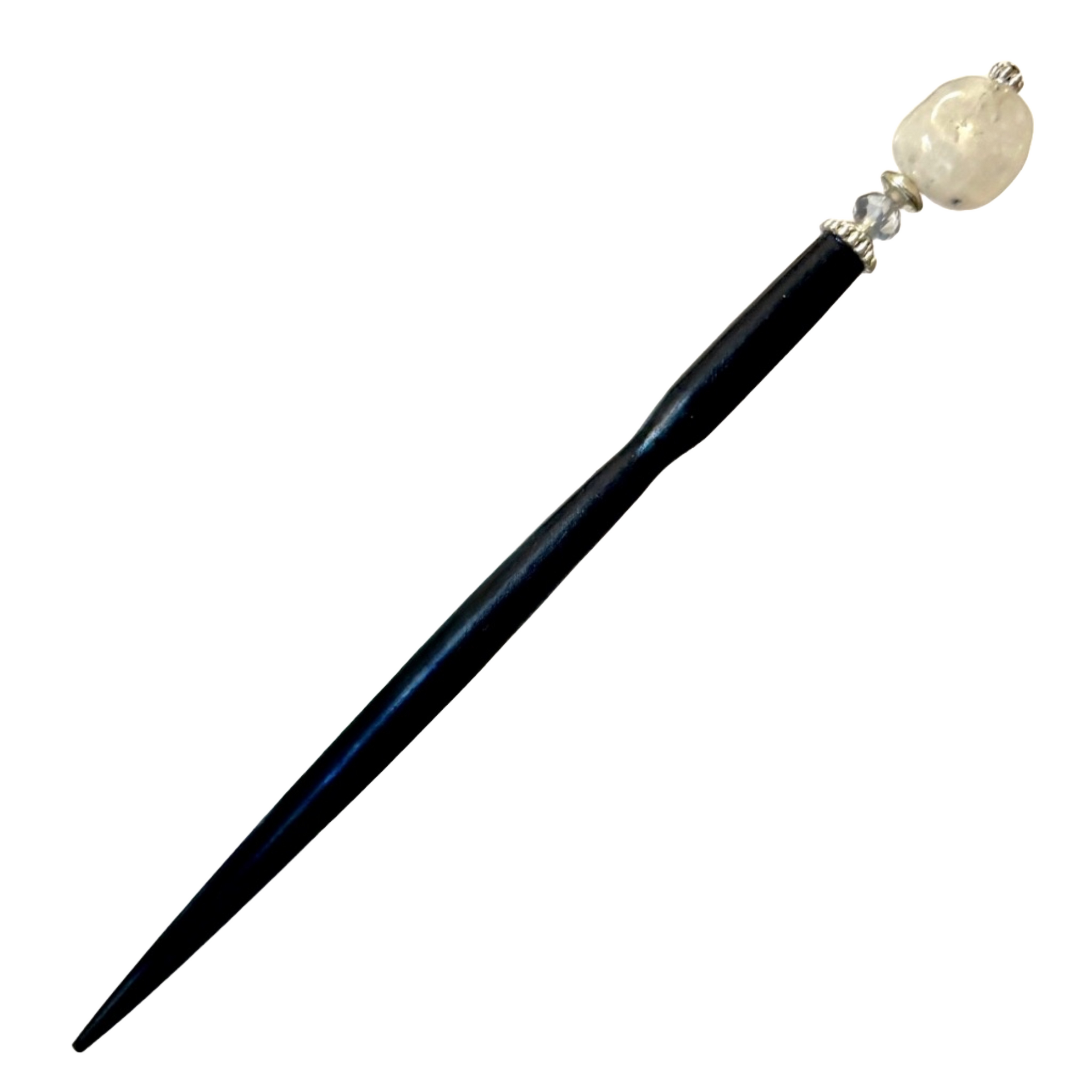 This stunning hair stick with a white Rainbow Moonstone flashes a multicolored iridescence in light. Bonus: it matches everything! Smaller accent crystal is iridescent very light blue. Because these are natural stones, please expect some variations in color and size.