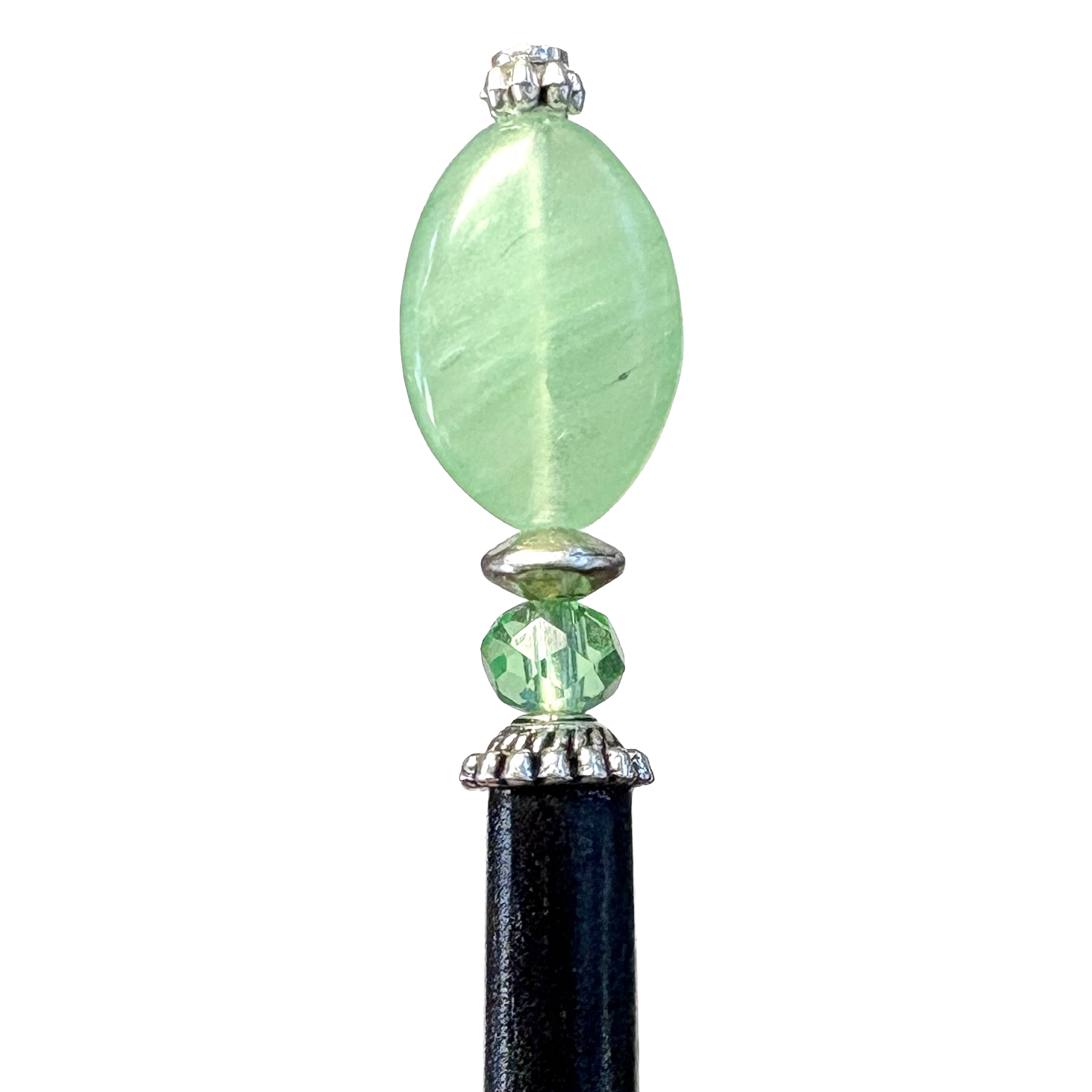 Whether it’s called sage, pistachio, celadon, watercress, or, just light green— this is a gorgeous pastel shade. Our Remy hair sticks are made with oval swirl green Czech glass beads to compliment your green outfits.