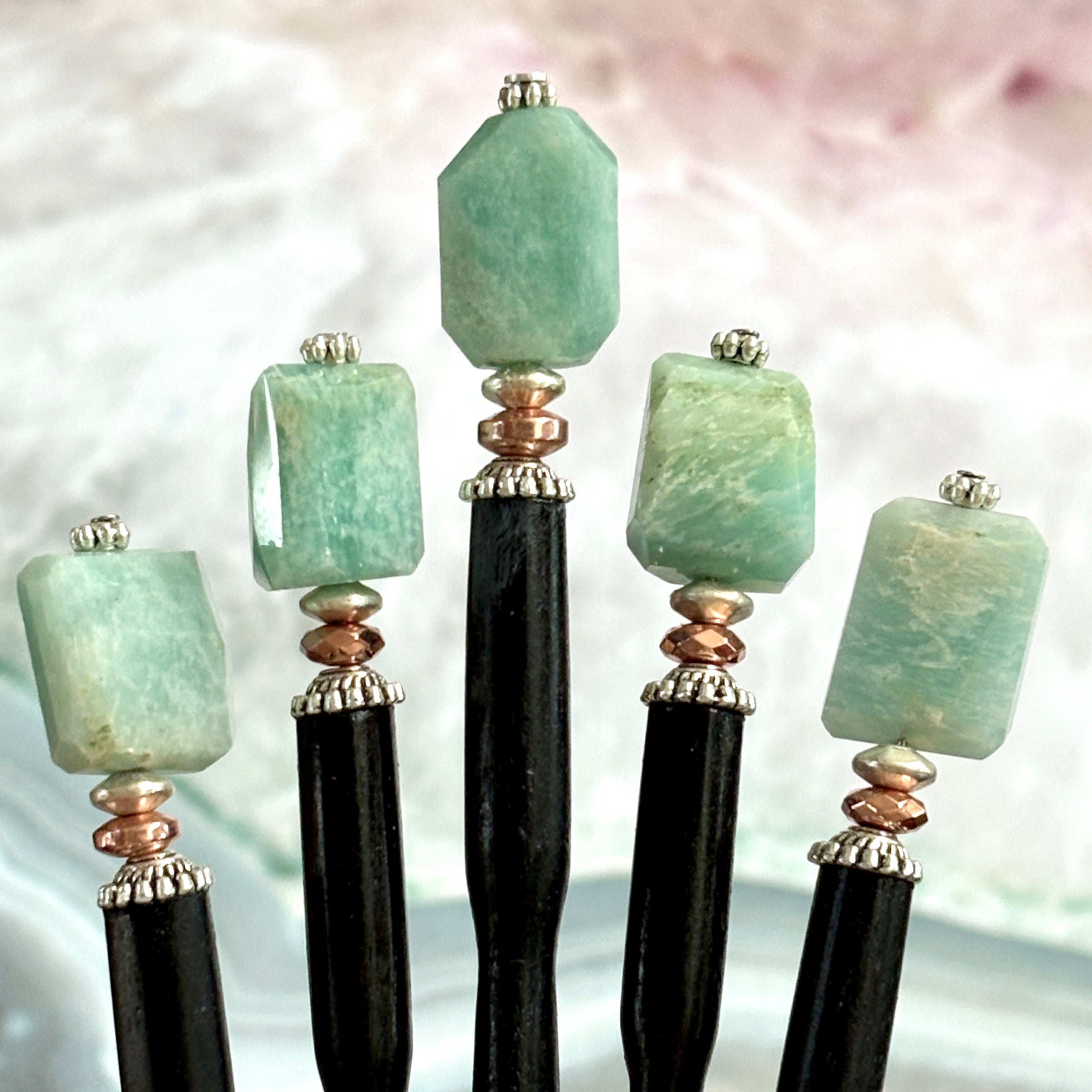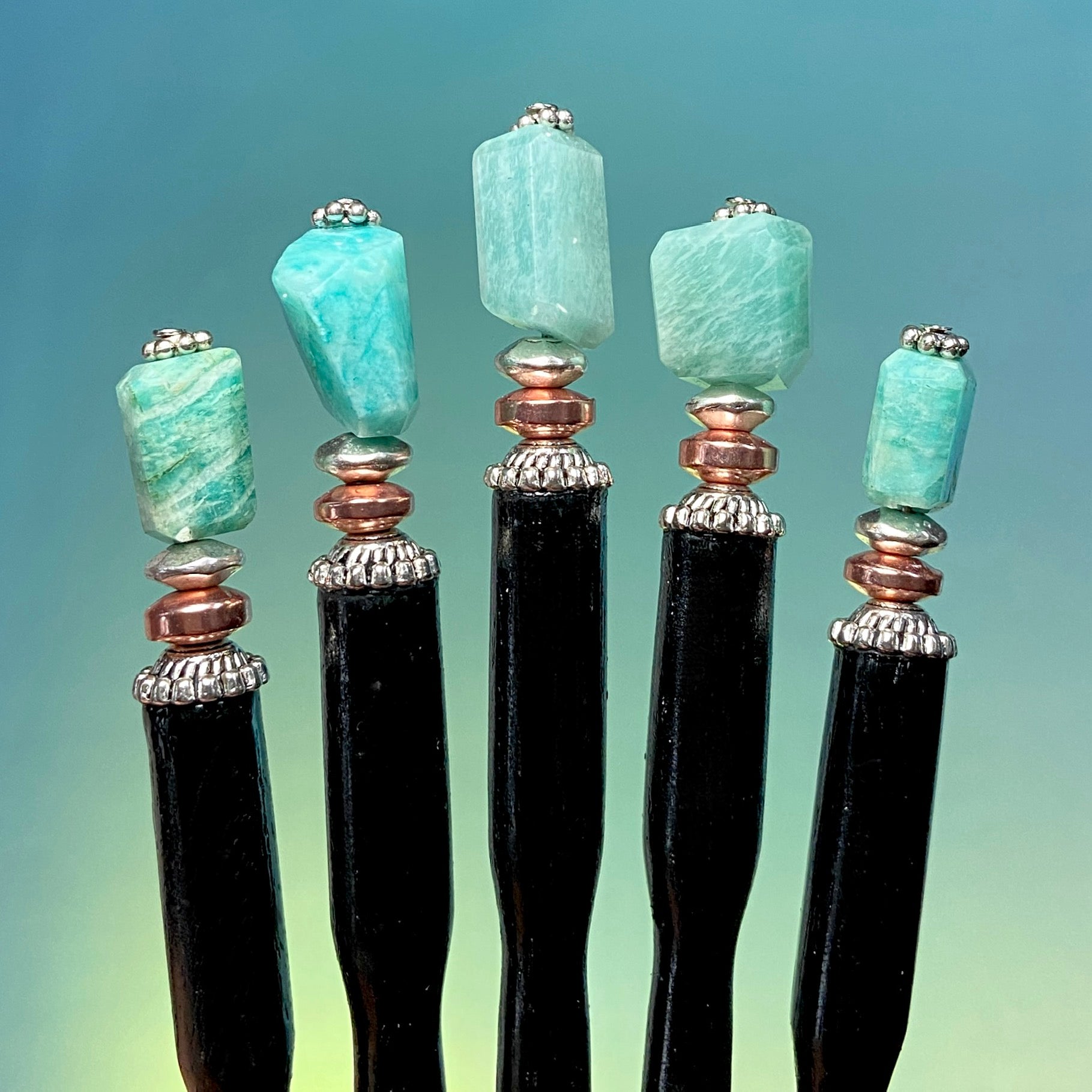 Looking for the perfect Boho hair accessory? The Amazonite nuggets in our Selina Hair Sticks have a variety of captivating shades of turquoise, unique freeform shapes, and the perfect copper accent bead. Because these are natural stones, please expect some variations in color and size.