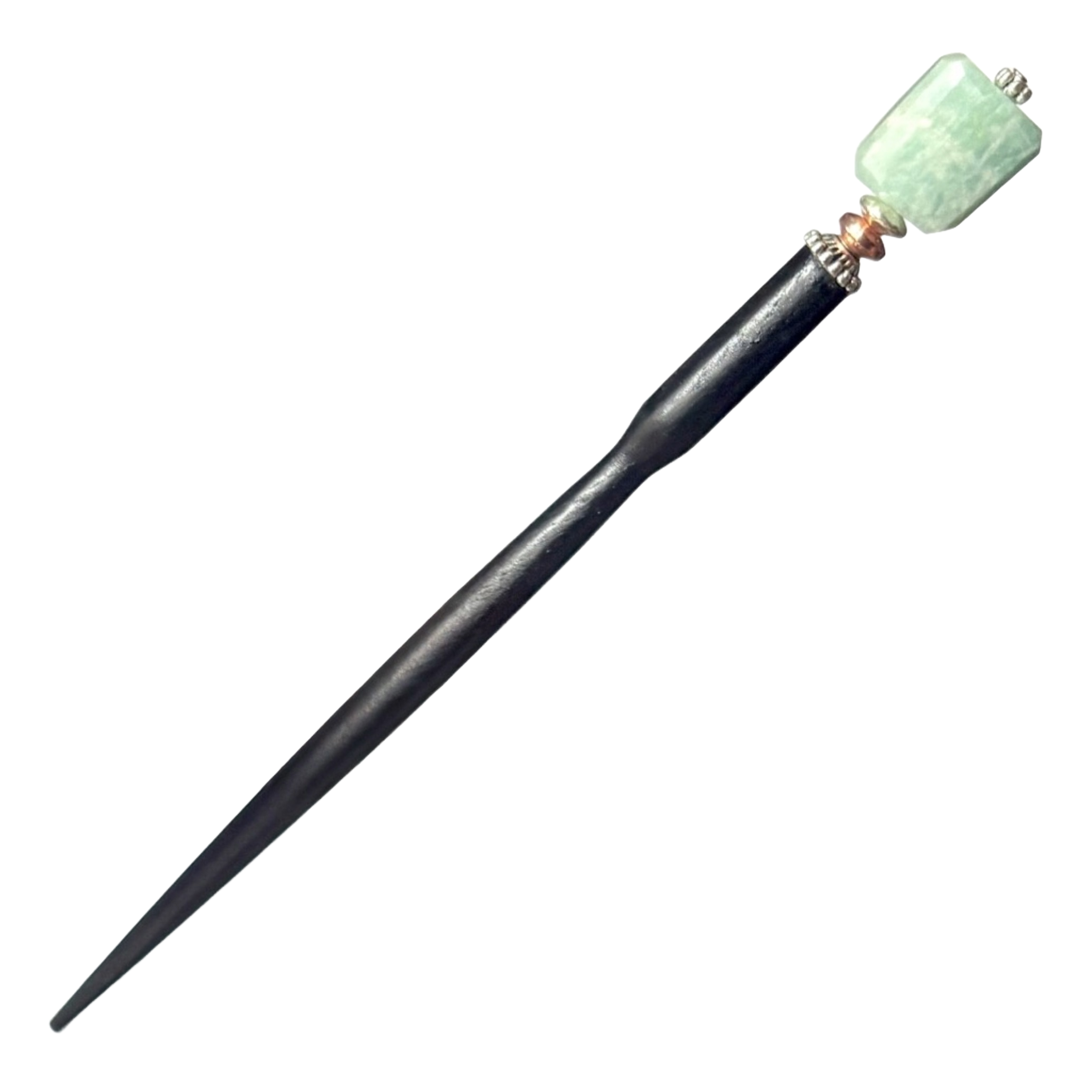 The standard base is a 4 1/2 inch black lacquered wood with a unique tapered shape, but after beads are added, the Hair Stick is around 5 1/2 to 6 inches total. A large 6 inch base is available at no additional cost. Most customers prefer to use the smaller 4 1/2 inch base, but you may want to go for the larger 6 inch size if your hair is extremely thick or very long. Click HERE to read more about sizes.
