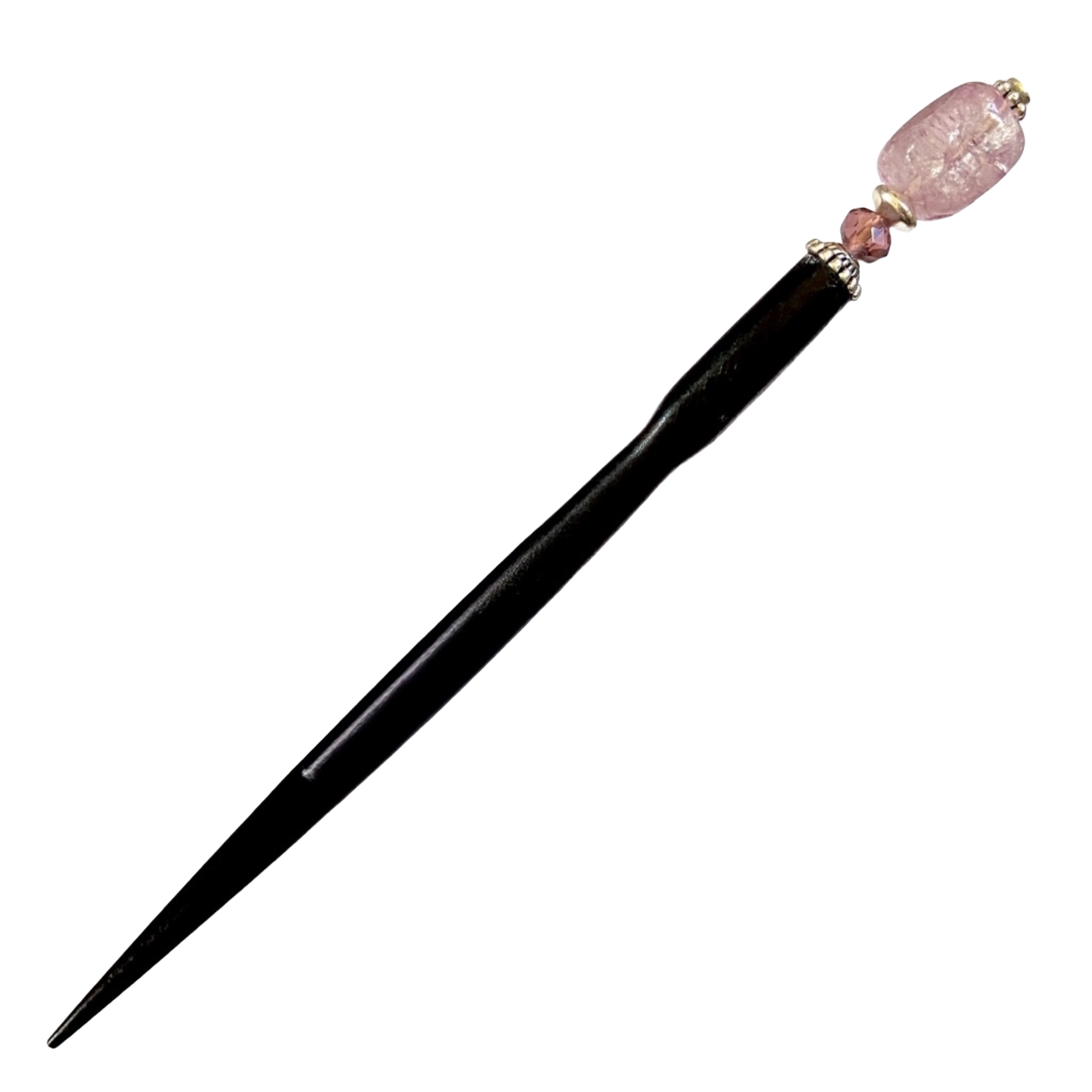 The standard base is a 4 1/2 inch black lacquered wood with a unique tapered shape, but after beads are added, the Hair Stick is around 5 1/2 to 6 inches total. A large 6 inch base is available at no additional cost. Most customers prefer to use the smaller 4 1/2 inch base, but you may want to go for the larger 6 inch size if your hair is extremely thick or very long. Click HERE to read more about sizes.