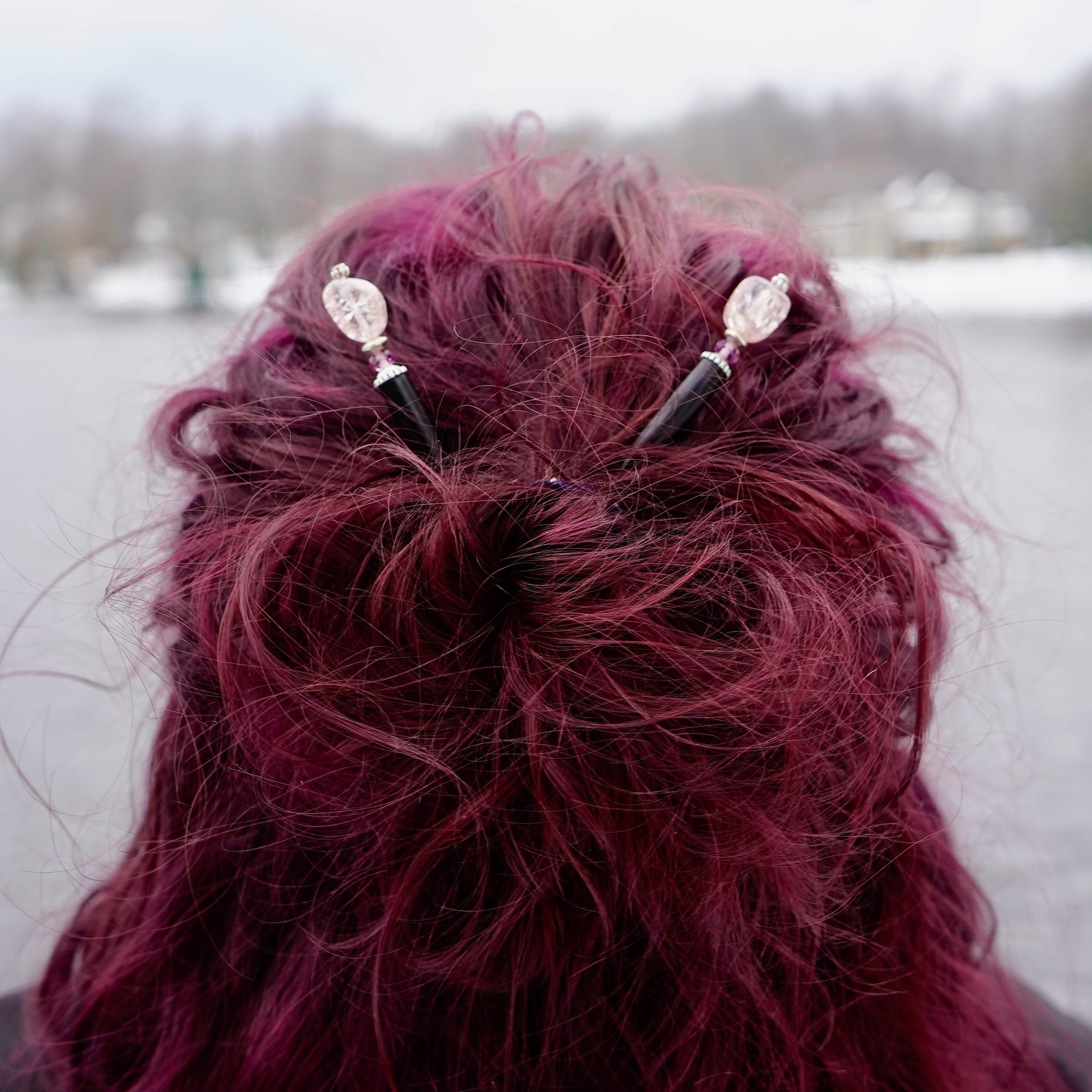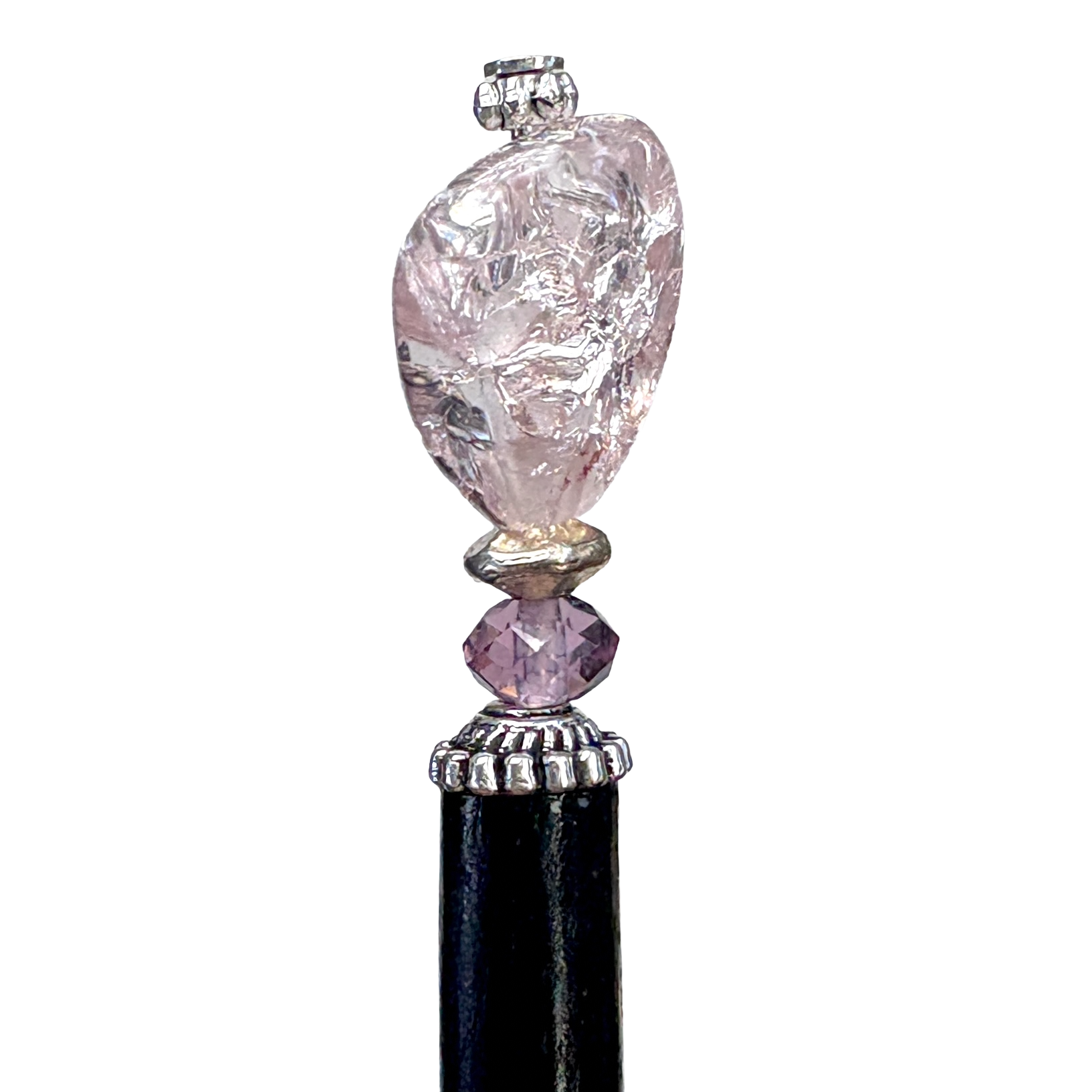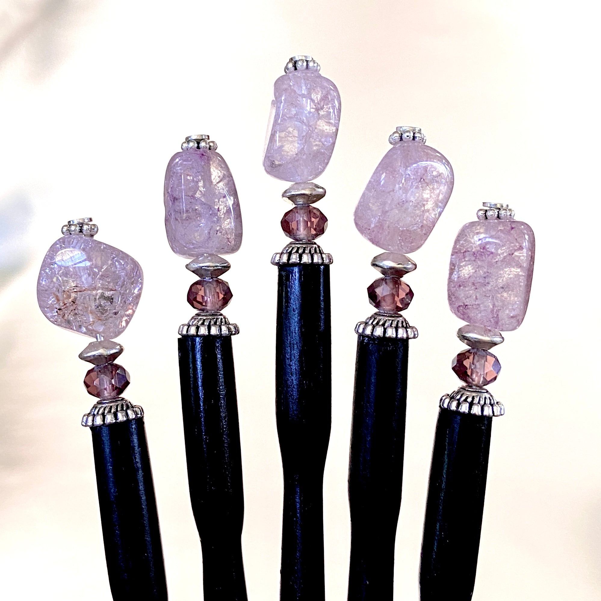 Ready to rush to the pretty pastel hue? The Taylor hair stick is made with purple Quartz nugget beads. These stunning Quartz stones have a crackle effect too for added sparkle! Colors can range from a lilac to lavender and may change appearance depending on the light. Because these are natural stones, please expect some variations in color and size.