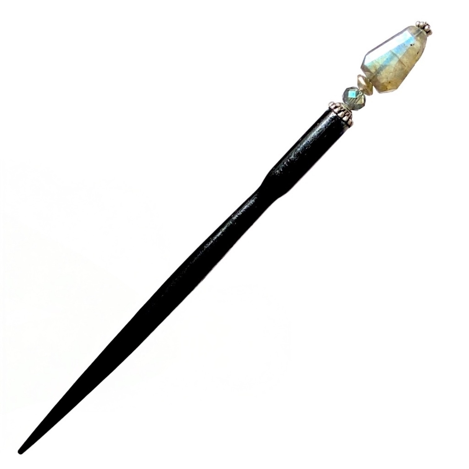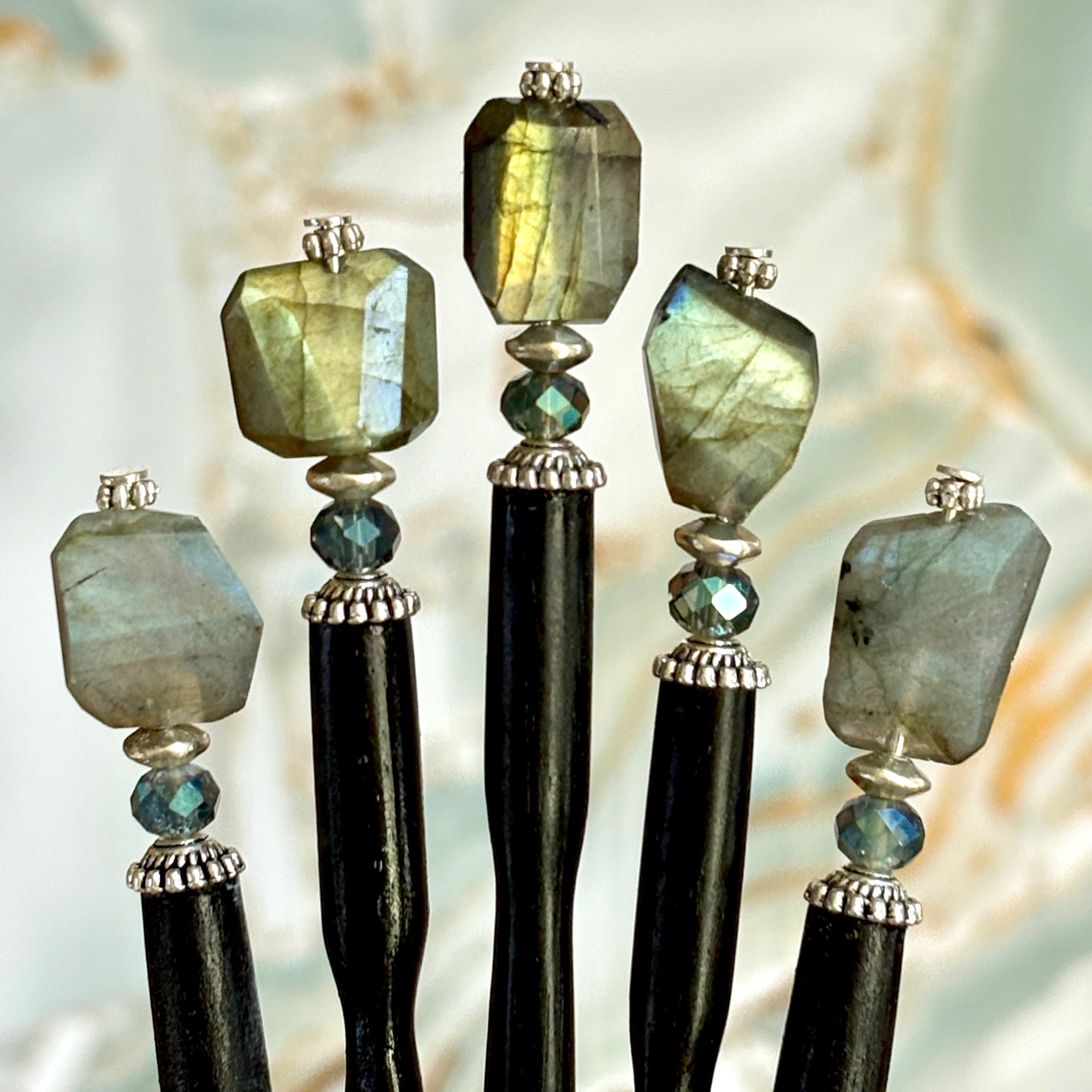 Our Dylan Hair Sticks are made with faceted gray Labradorite nuggets that flash beautiful colors in the light. Colors can range from yellows, greens, blues, and violet. Each stone is inspected to assure some flashes in any we sell. Expect variations in shape and sizes of natural stones. These handmade beauties are sure to elevate your everyday hair bun!