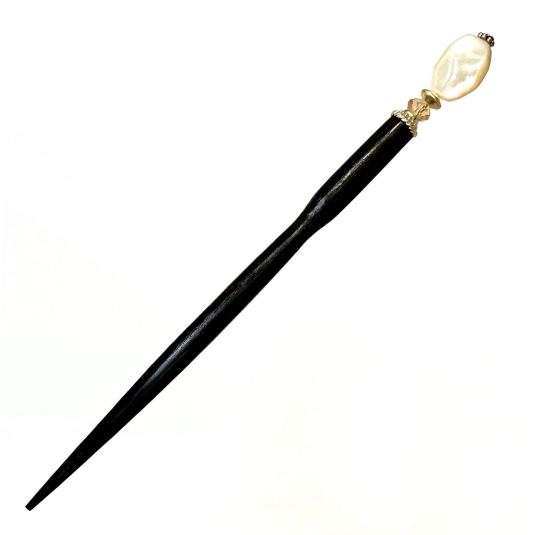 The standard base is a 4 1/2 inch black lacquered wood with a unique tapered shape, but after beads are added, the Hair Stick is around 5 1/2 to 6 inches total. A large 6 inch base is available at no additional cost. Most customers prefer to use the smaller 4 1/2 inch base, but you may want to go for the larger 6 inch size if your hair is extremely thick or very long. Click HERE to read more about sizes.