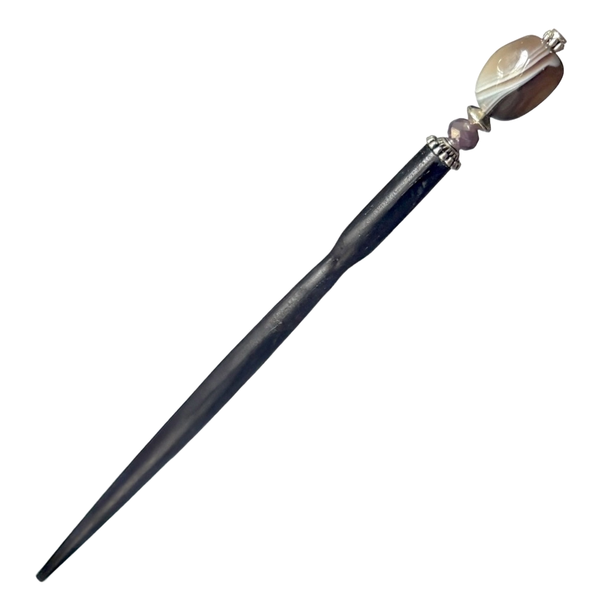 Our Cassie Hair Stick is for that all-natural girl! The Agate nugget has swirls of colors that range from grays and dusty purples.