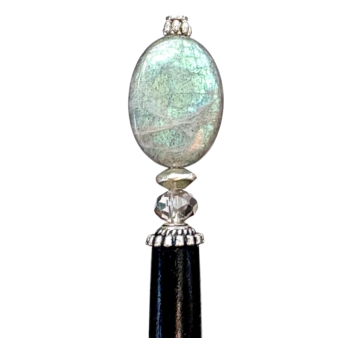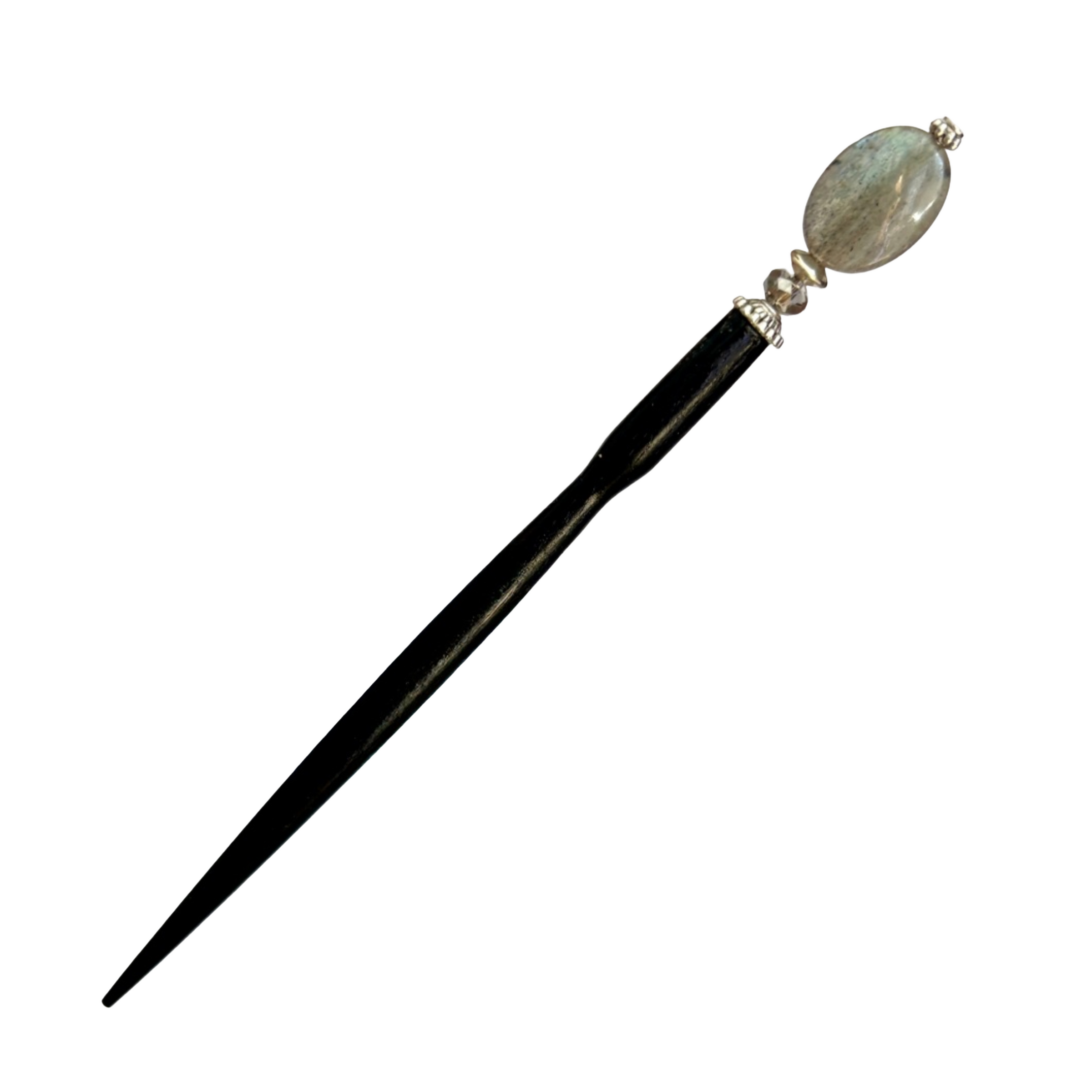 The standard base is a 4 1/2 inch black lacquered wood with a unique tapered shape, but after beads are added, the Hair Stick is around 5 1/2 to 6 inches total. A large 6 inch base is available at no additional cost. Most customers prefer to use the smaller 4 1/2 inch base, but you may want to go for the larger 6 inch size if your hair is extremely thick or very long. Click HERE to read more about sizes.