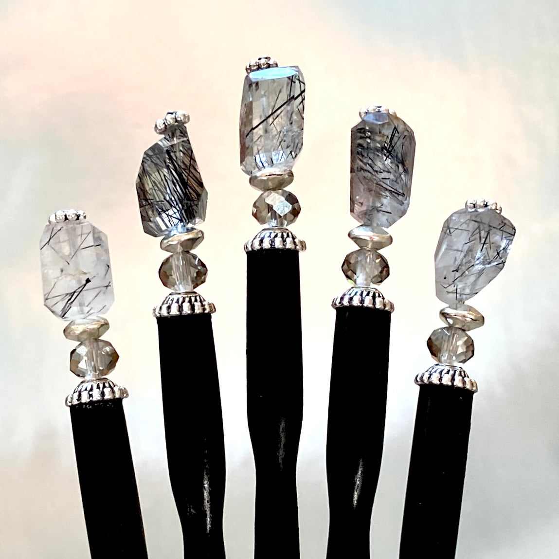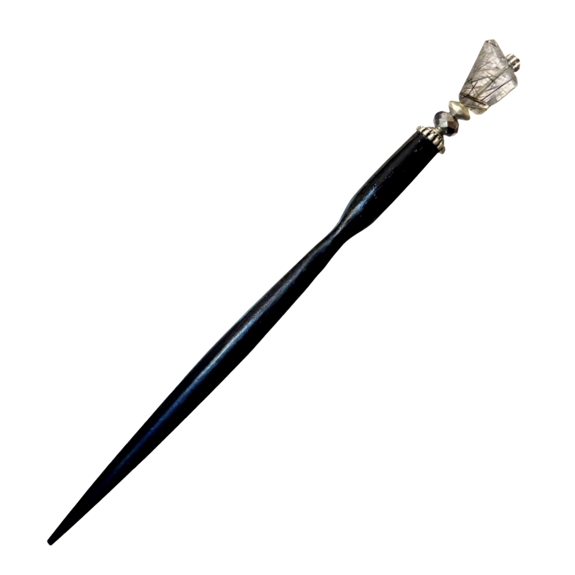 The standard base is a 4 1/2 inch black lacquered wood with a unique tapered shape, but after beads are added, the Hair Stick is around 5 1/2 to 6 inches total. A large 6 inch base is available at no additional cost. Most customers prefer to use the smaller 4 1/2 inch base, but you may want to go for the larger 6 inch size if your hair is extremely thick or very long. Click HERE to read more about sizes.