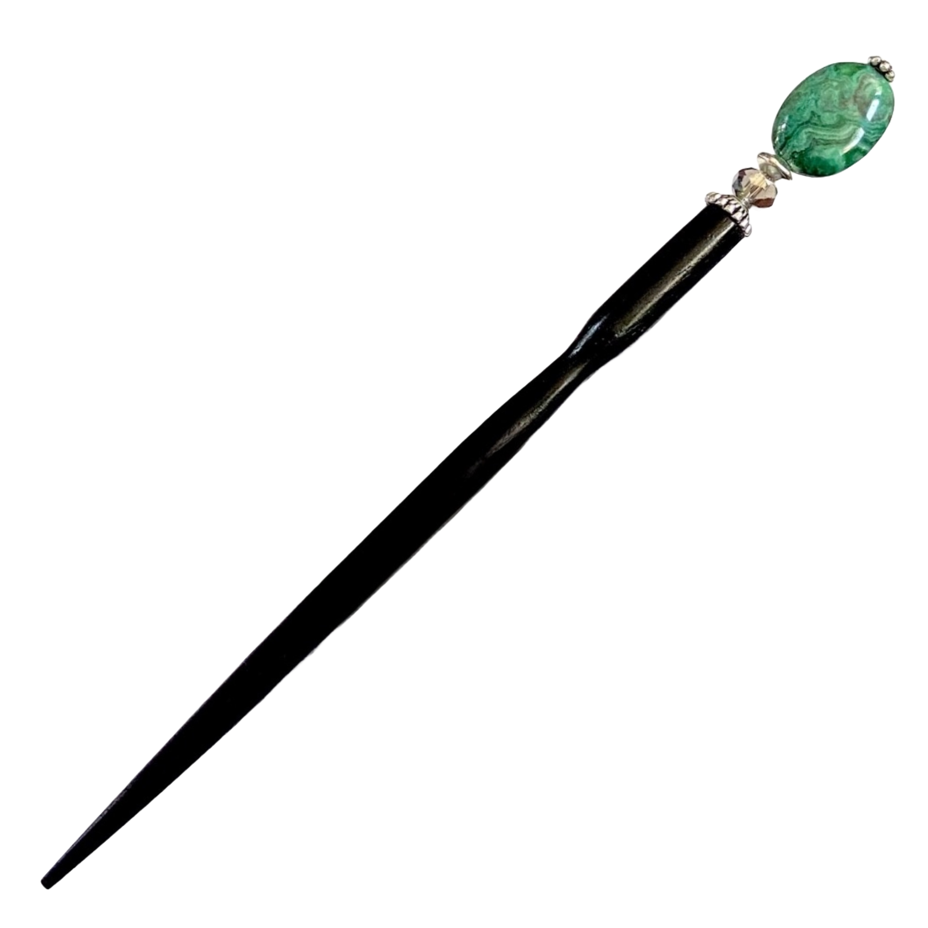 The standard base is a 4 1/2 inch black lacquered wood with a unique tapered shape, but after beads are added, the Hair Stick is around 5 1/2 to 6 inches total. A large 6 inch base is available at no additional cost. Most customers prefer to use the smaller 4 1/2 inch base, but you may want to go for the larger 6 inch size if your hair is extremely thick or very long. Click HERE to read more about sizes.