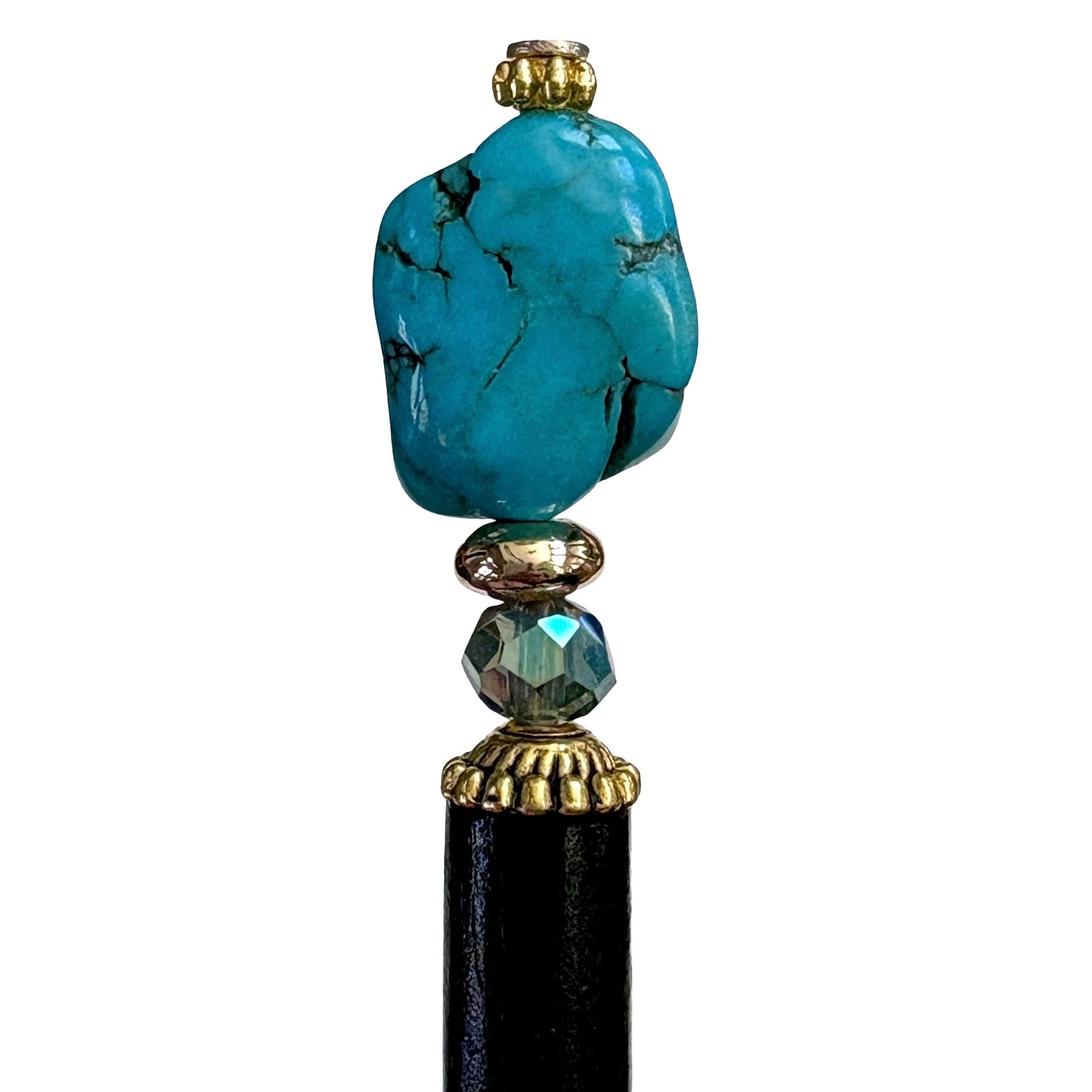 The standard base is a 4 1/2 inch black lacquered wood with a unique tapered shape, but after beads are added, the Hair Stick is around 5 1/2 to 6 inches total. A large 6 inch base is available at no additional cost. Most customers prefer to use the smaller 4 1/2 inch base, but you may want to go for the larger 6 inch size if your hair is extremely thick or very long. Click HERE to read more about sizes.