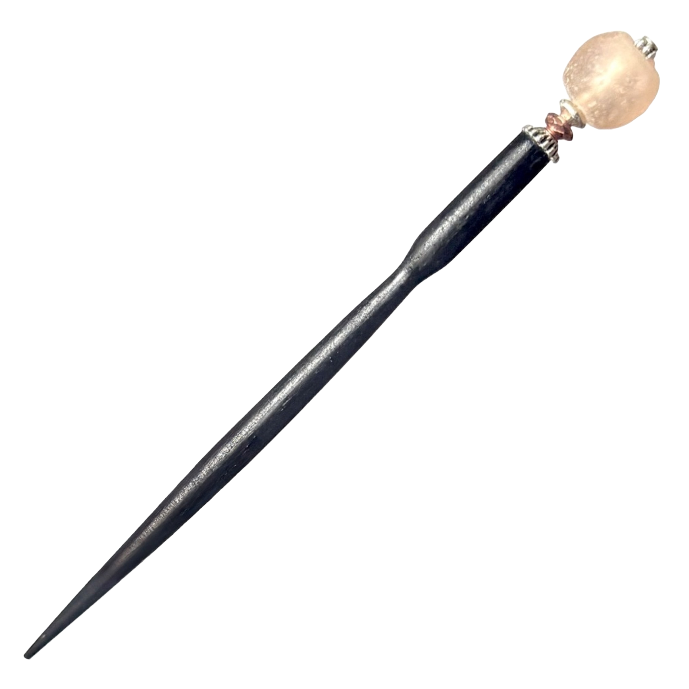 Like our Daliah Tidal Hair Stick, the Ellen stick is made with African Recycled Glass beads. Ellen's glass bead is a blush-pink color and has a small rose gold crystal accent rondelle. These beads are made by the Krobo People of Ghana by crushing glass to a fine powder and heating it so that the particles fuse together. The glass is then poured into clay molds, with a cassava leaf stem used to make the hole. They are baked in an oven and the glass fuses and the cassava stem burns up. This technique has been used in Africa for centuries.